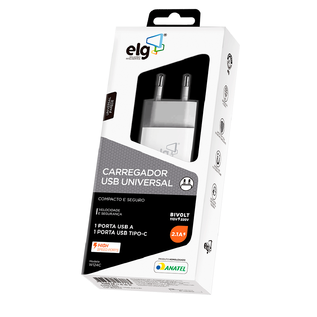 O Carregador de parede ELG possui tamanho compacto e moderno, trazendo mais comodidade ao seu dia-a-dia. Com uma porta USB tipo A e uma porta USB Tipo-C possui máxima compatibilidade com dispositivos recarregáveis através de portas USB. Permite a carregamento de dois dispositivos simultaneamente. Carga rápida (BOOST EXTRA). Conectores de alta eficiência. Desenvolvido em polímero antichamas.