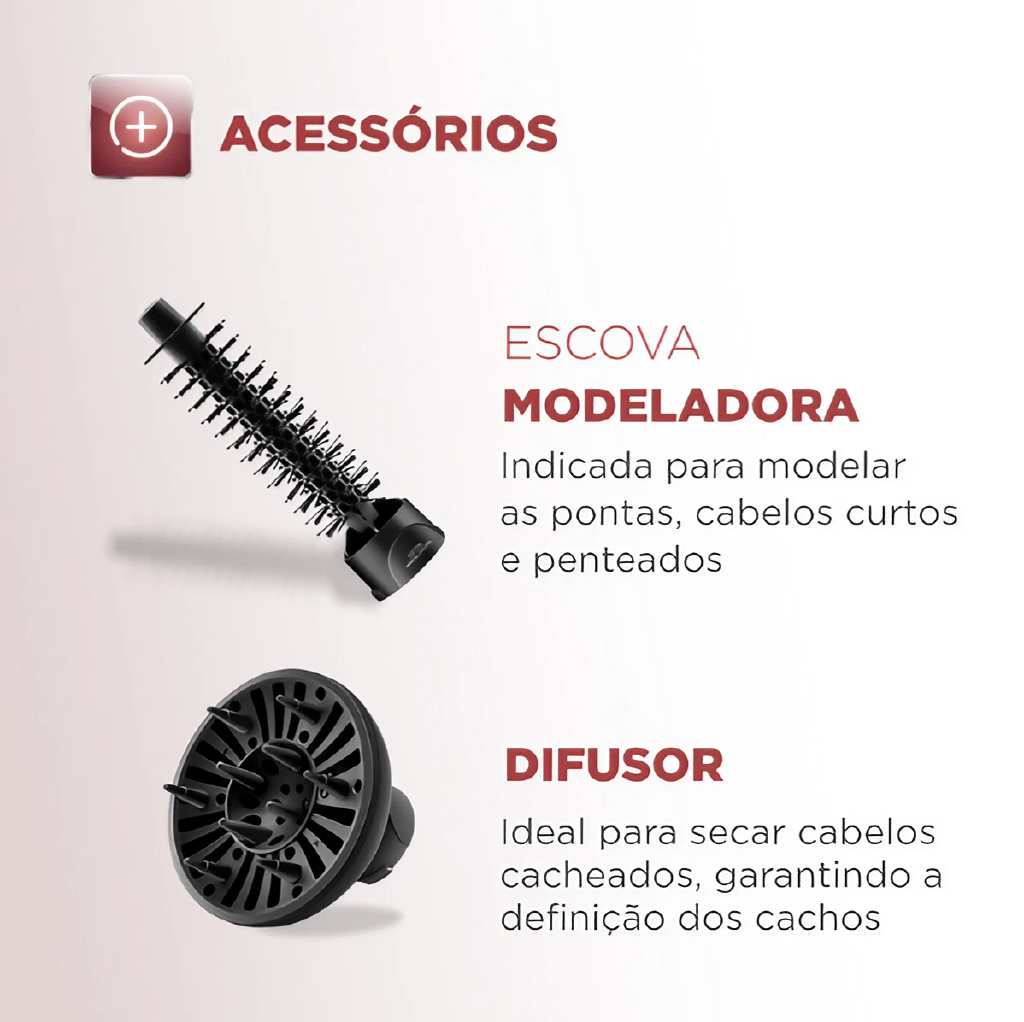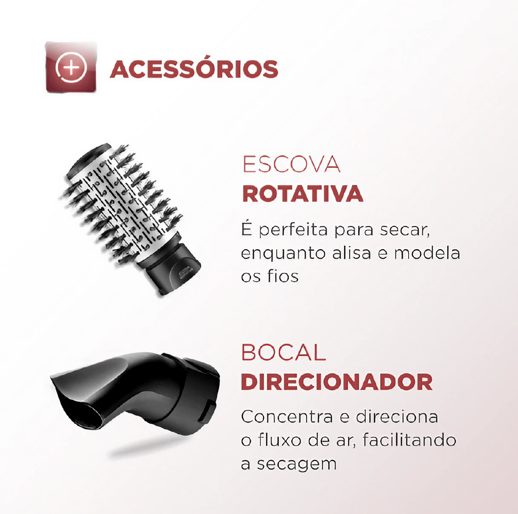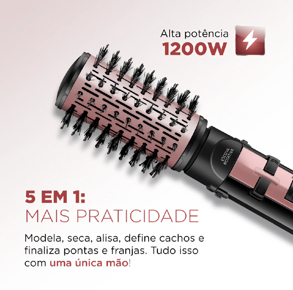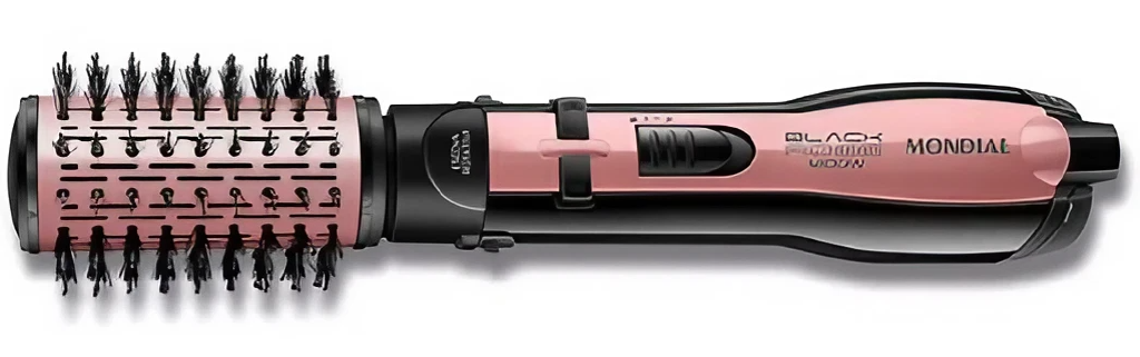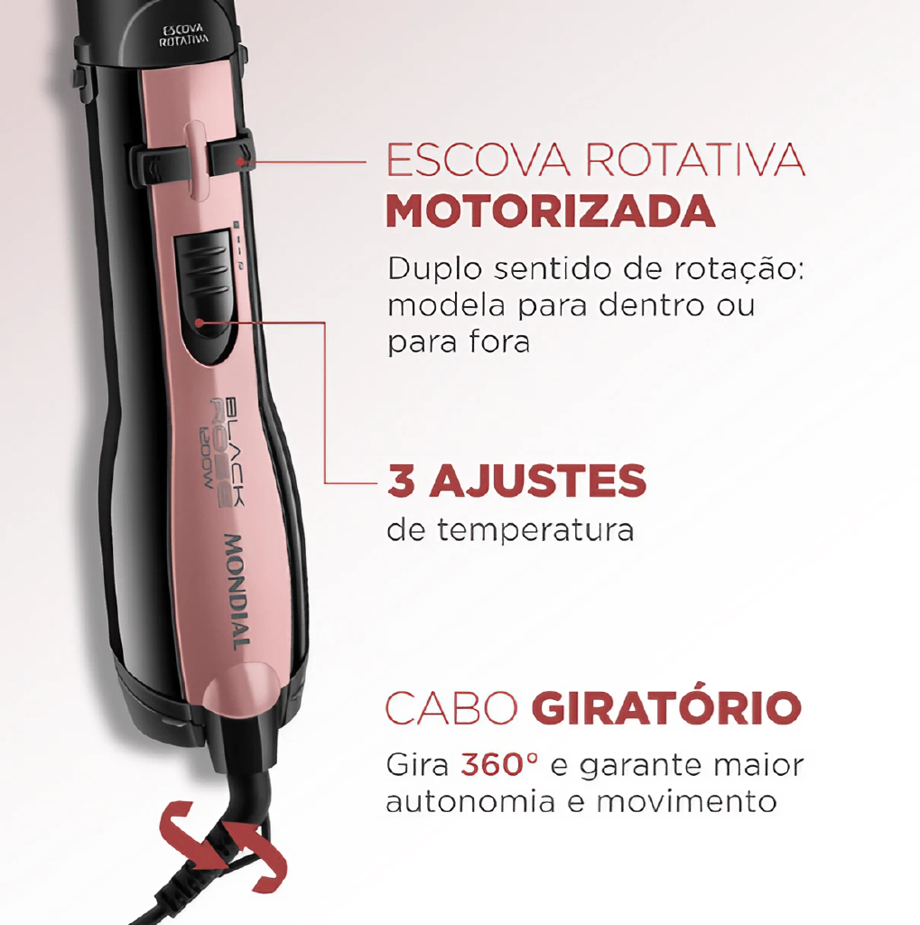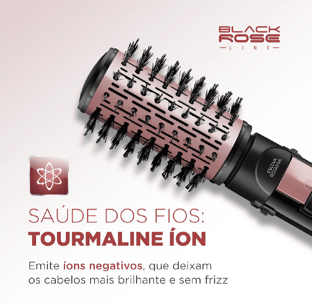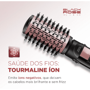 Cabelos prontos mais rápido, com efeito duradouro e com mais brilho, todos os dias, conte com a Escova Rotativa Black Rose da Mondial tem o revestimento cerâmico com tourmaline íon, que proporciona um cabelo com saudáveis, brilhante e sem frizz. DUPLO SENTIDO DE ROTAÇÃO Gira 360° nos 2 sentidos permitindo uma modelagem perfeita, além de finalizar pontas e franjas, para dentro ou para fora; 2 AJUSTES TEMPERATURA E AR FRIO.